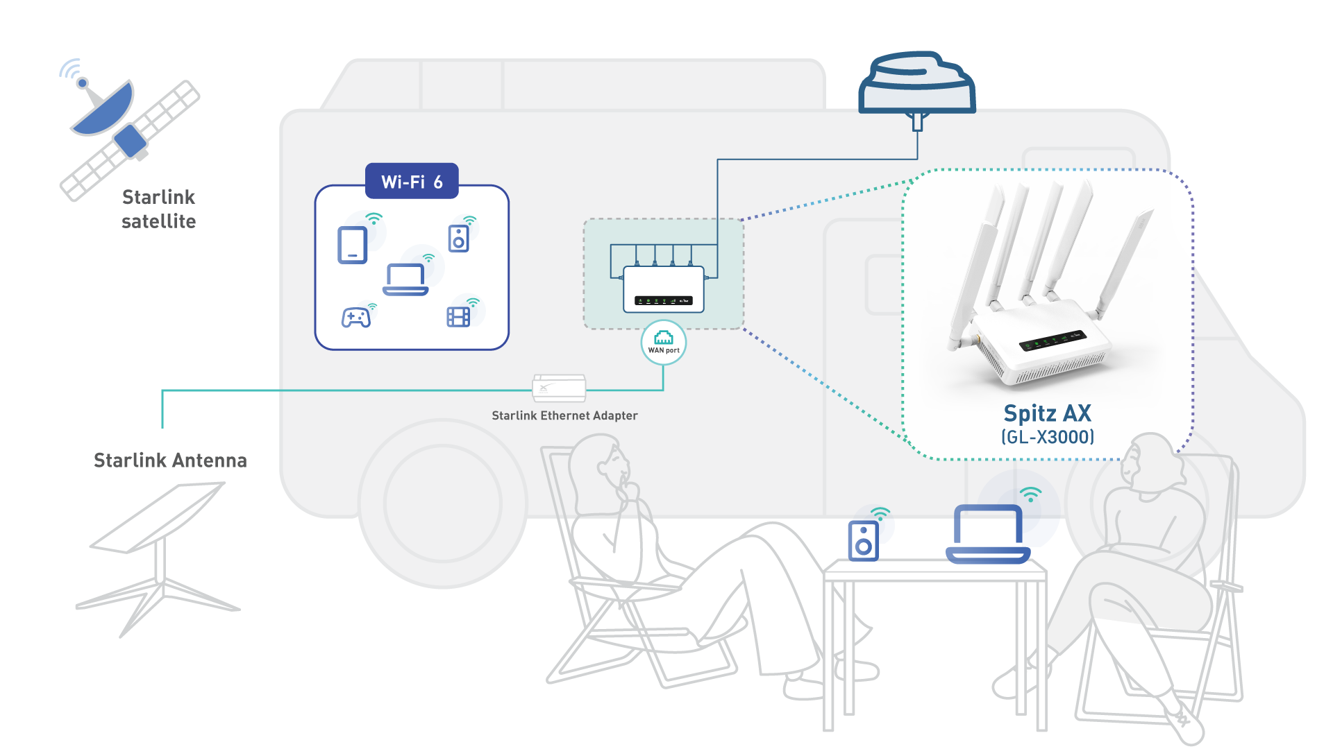 GL-X3000 (Spitz AX) er udviklet med mobile installationer for øje. Den kan forsynes direkte på 12 volt, installeres permanent og fungerer som central internet- og Wi-Fi-løsning i autocamperen.